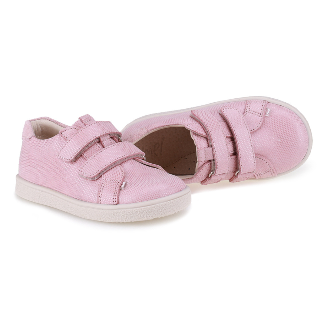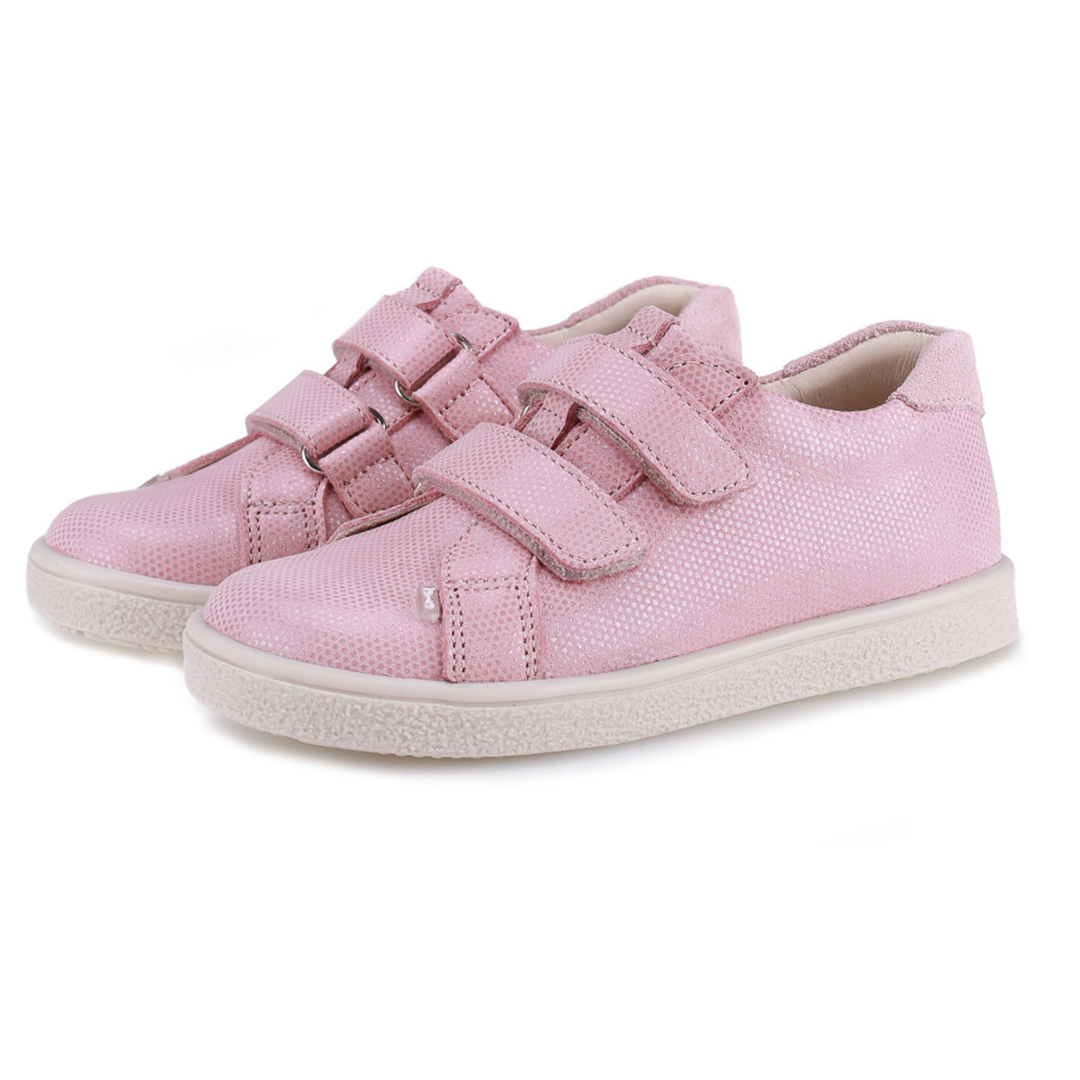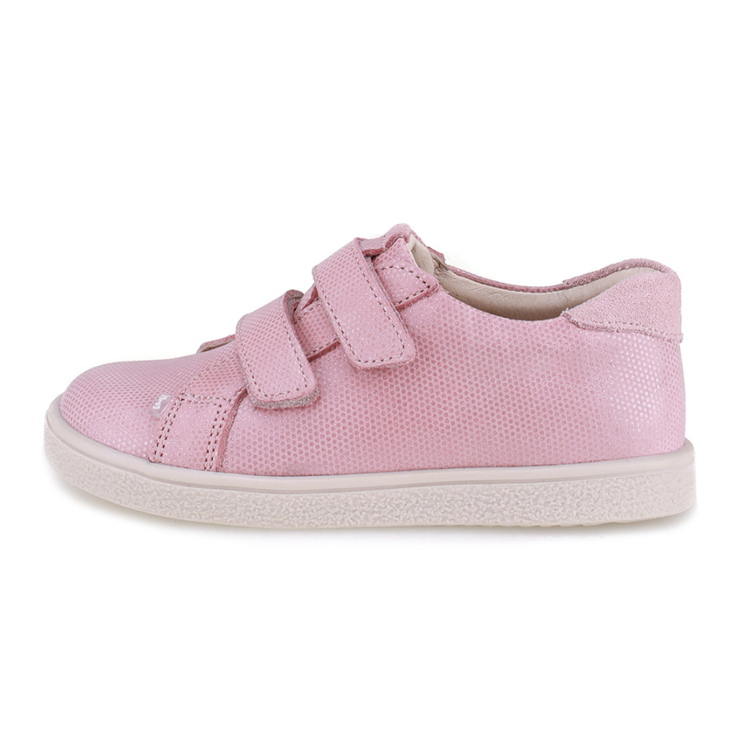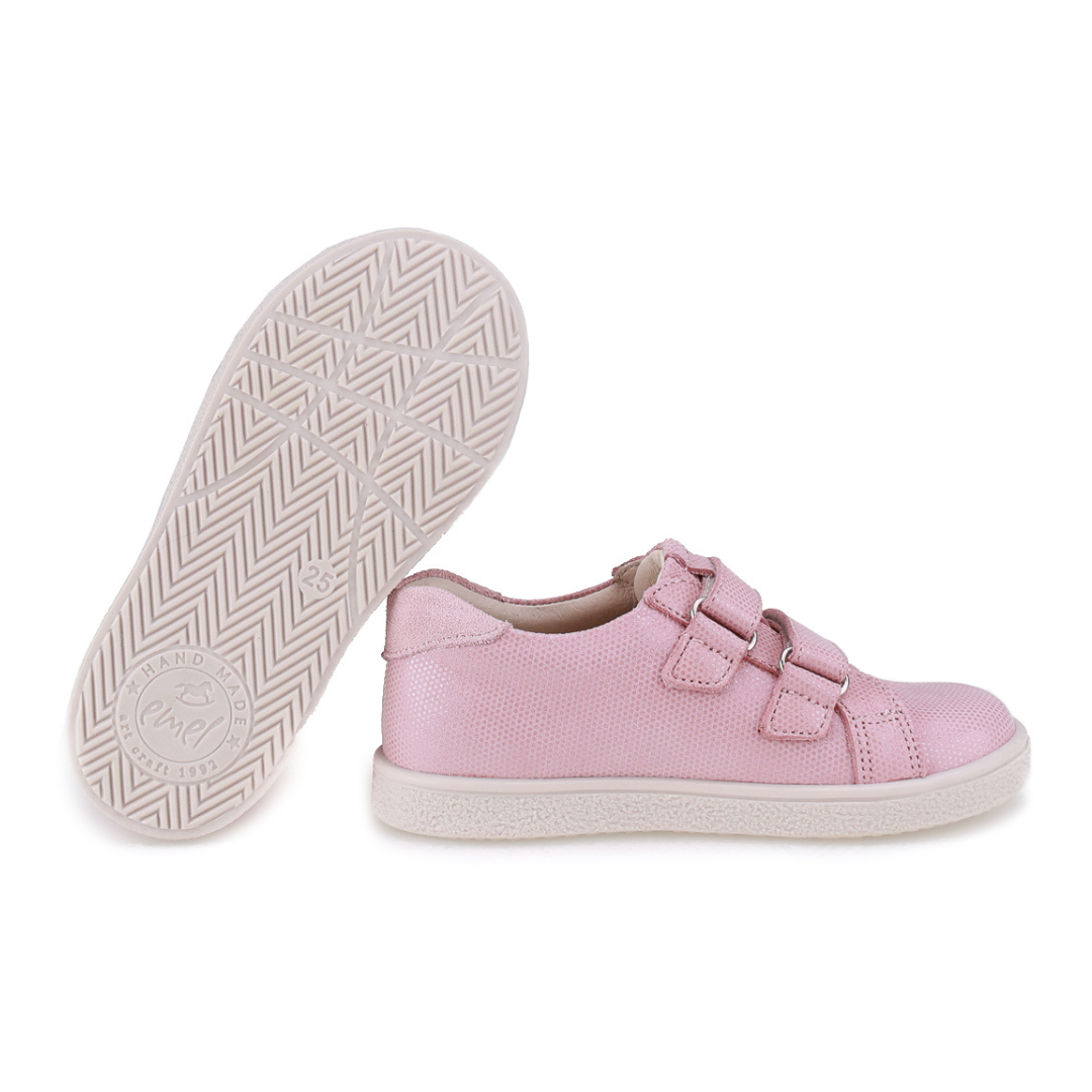 Różowe trampki dziecięce EMEL MADRID to lekkie półbuty dla dziewczynki wykonane ze skóry naturalnej, które łączą sportowy styl klasycznych trampek z komfortem skórzanego obuwia dziecięcego. Model zapinany jest na dwa wygodne rzepy, dzięki którym buty można łatwo dopasować do stopy dziecka i szybko je założyć.