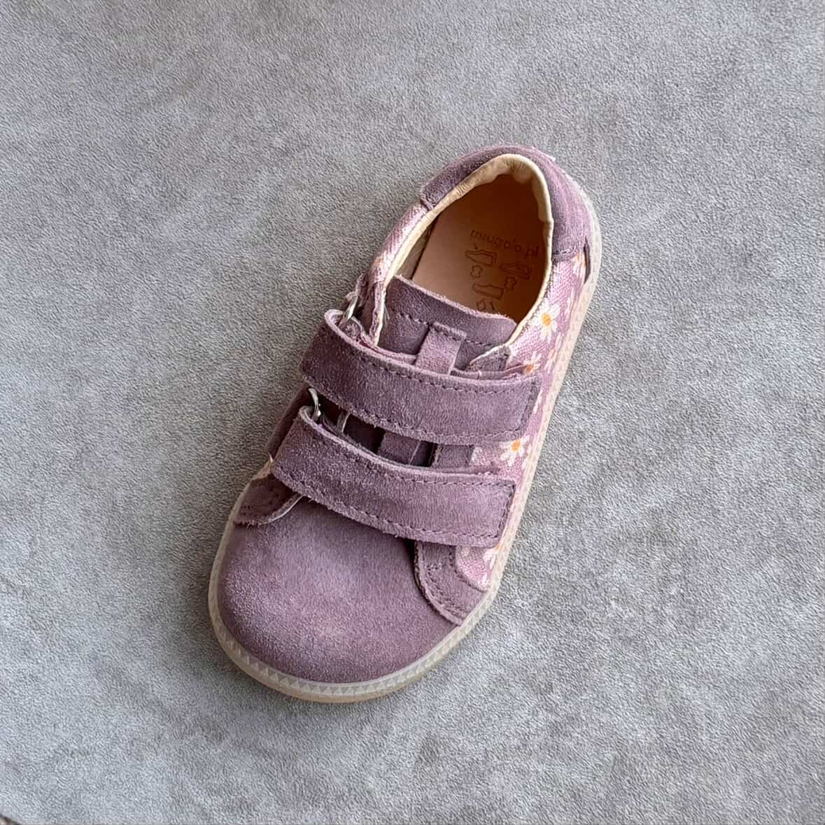 Półbuty dziecięce MRUGAŁA LUMI BAREFOOT lawenda to skórzane półbuty dziecięce barefoot, które łączą komfort, zdrowy rozwój stóp i modny design. Wierzch wykonany jest z naturalnej skóry welurowej (przód, rzepy i zapiętek) oraz materiału canvas z kolorowym printem w urocze stokrotki – co bez wątpienia spodoba się małym i większym dziewczynkom. Dzięki podeszwie barefoot palce mają pełną swobodę ruchu, a system zero drop utrzymuje stopę w naturalnej pozycji, jak podczas chodzenia boso.
