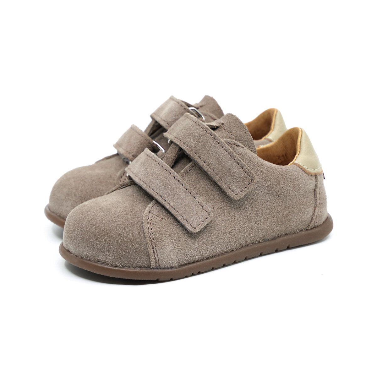 Buty wykonane są z miękkiej skóry welurowej w kolorze szarobeżowym, która dobrze dopasowuje się do stopy i zapewnia wysoki komfort noszenia. Wnętrze wyściełane jest naturalną skórą, dzięki czemu obuwie jest przyjazne dla delikatnej skóry dziecka i zapewnia odpowiednią oddychalność.