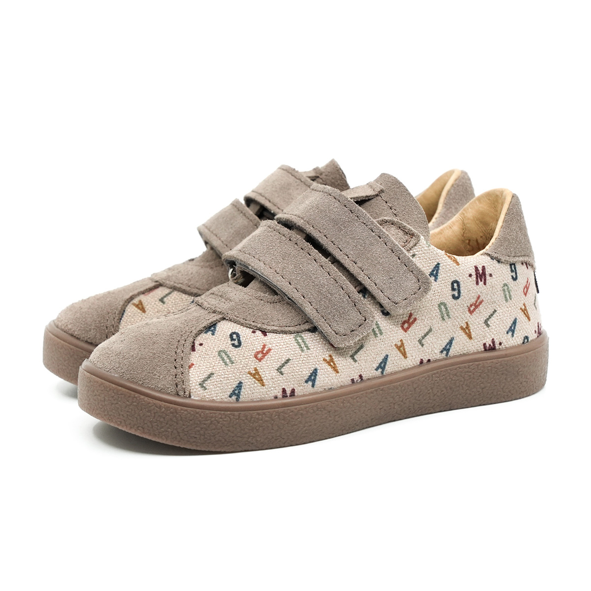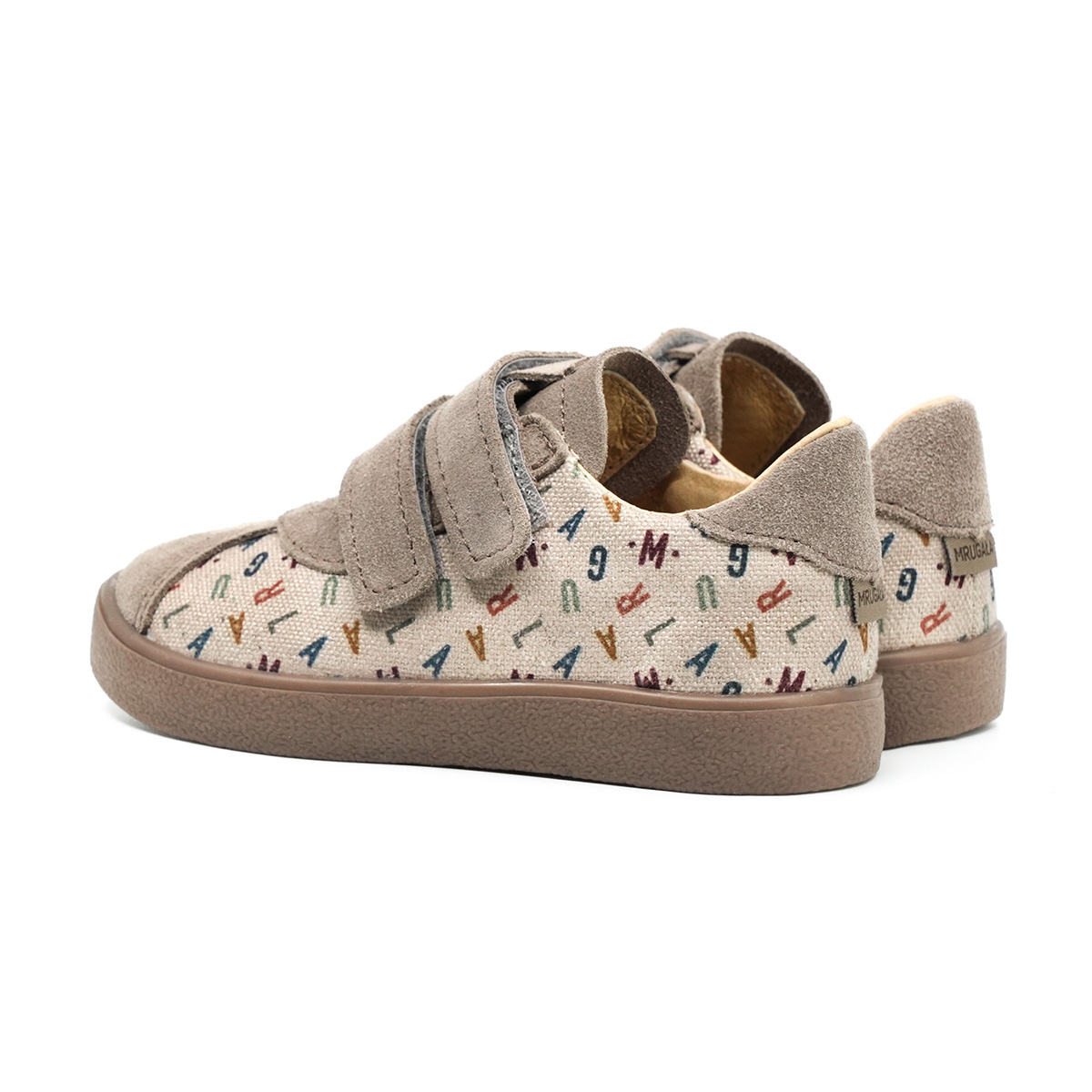 Nosek, rzepy oraz język wykonane są z naturalnej skóry welurowej w kolorze szarym, natomiast boki buta uszyto z materiału Canvas w kolorze popielatym, ozdobionego kolorowym printem w rozsypane literki tworzące logo MRUGAŁA. Takie zestawienie materiałów sprawia, że buty są atrakcyjne wizualnie, a jednocześnie wygodne w codziennym noszeniu.