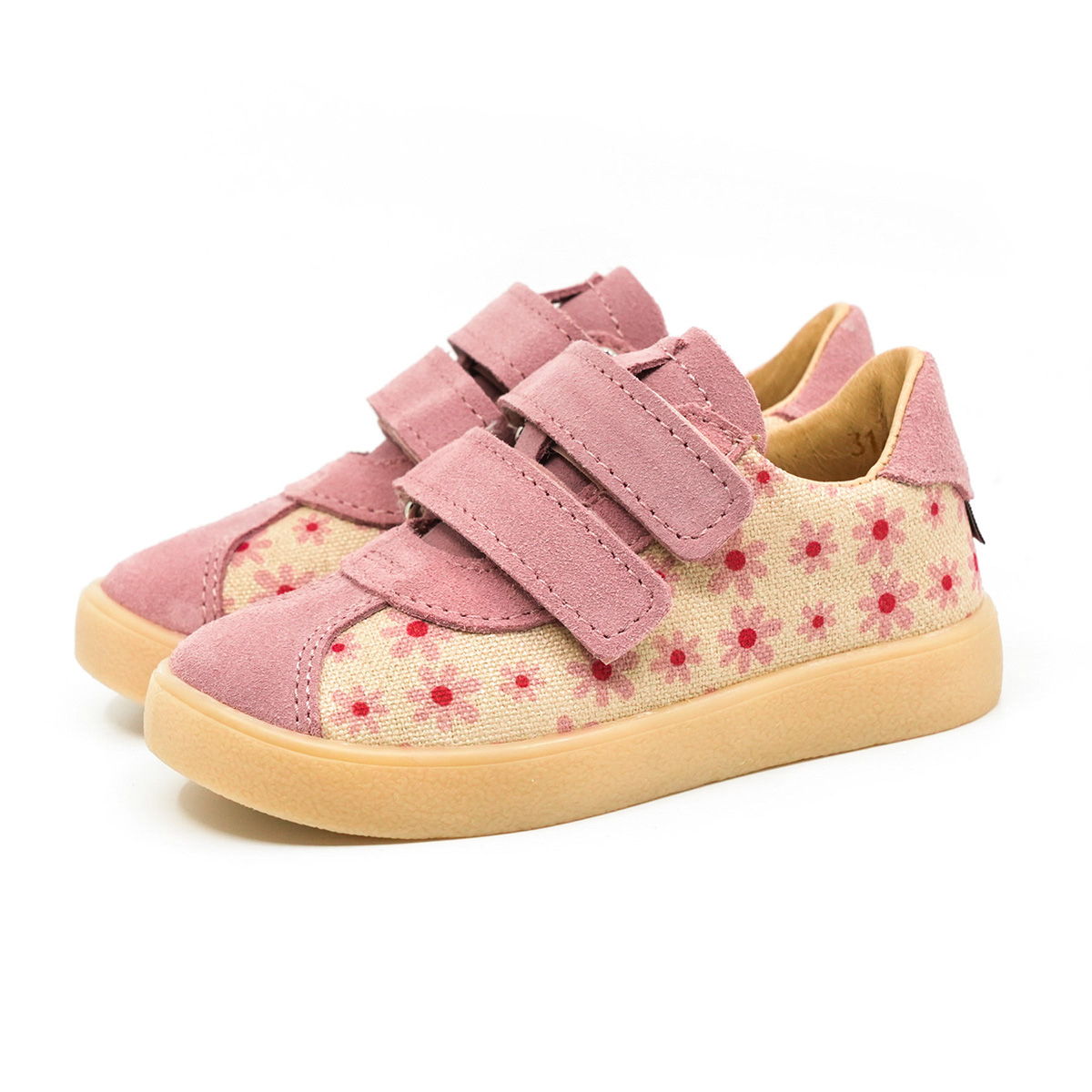 ✔️ Wierzch: skóra naturalna welurowa w kolorze flamingo (nosek, rzepy, język) + materiał Canvas w kolorze jasnego beżu z printem w stokrotki
