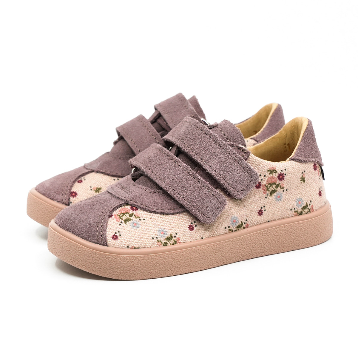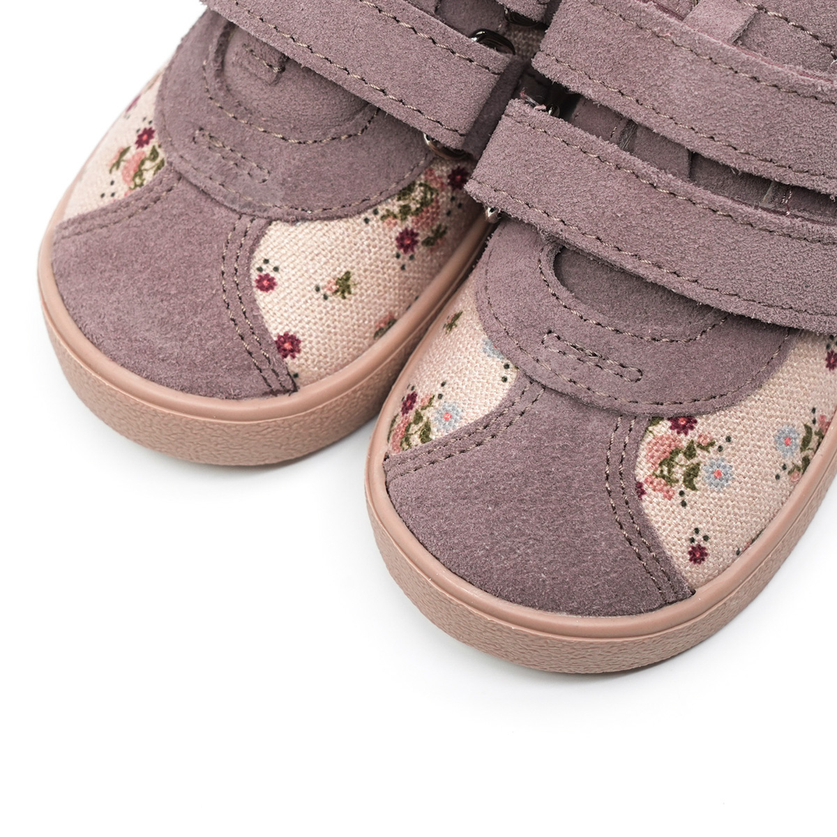 ✔️ Wierzch: skóra naturalna welurowa w kolorze lawendy (nosek, rzepy, język) + materiał Canvas z printem w kwiatuszki