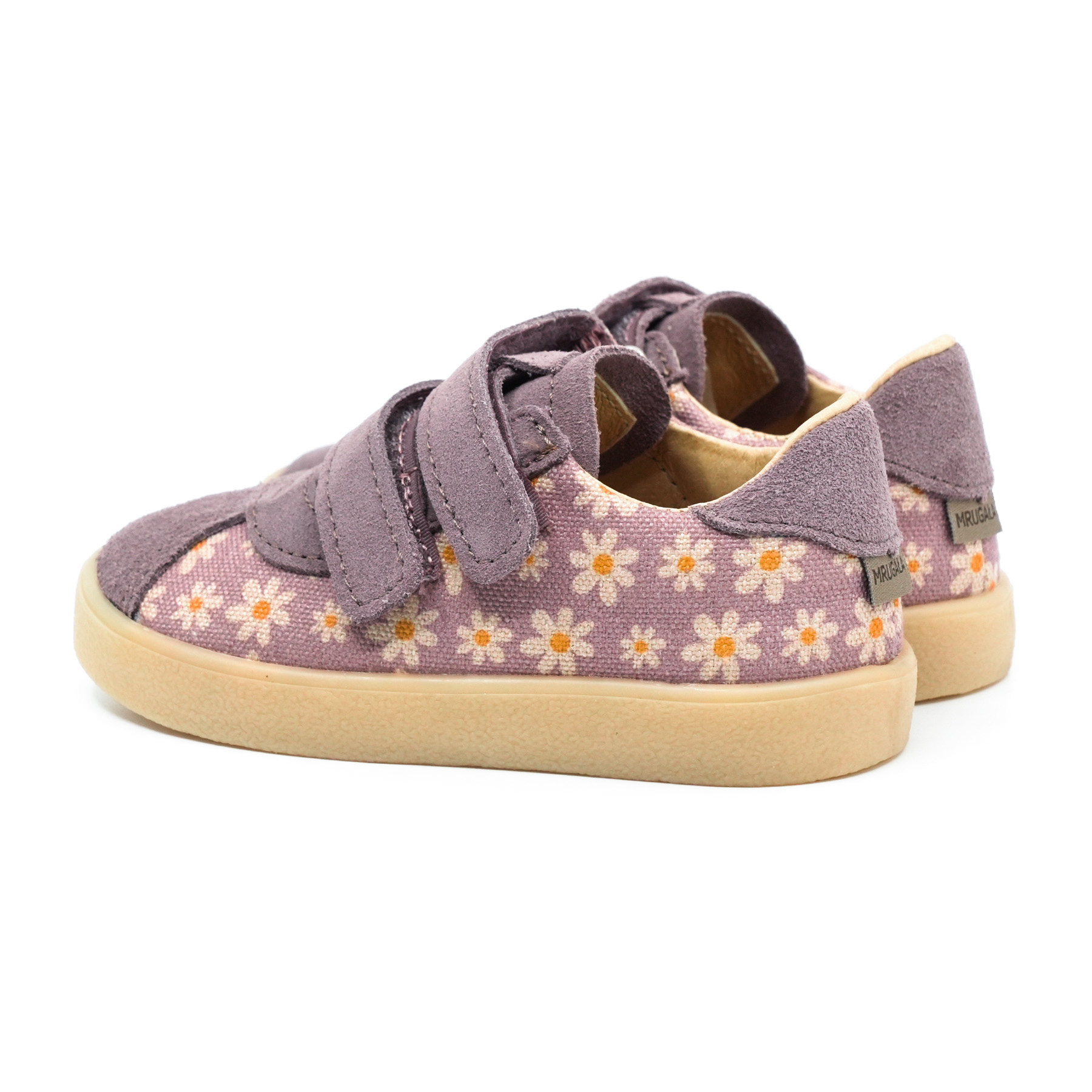 Półbuty dziecięce MRUGAŁA PIKO lawenda daisy to lekkie i wygodne skórzane półbuty dziecięce, zaprojektowane z myślą o codziennym użytkowaniu. Model łączy naturalną skórę welurową w lawendowym kolorze z materiałem Canvas, ozdobionym delikatnym printem w stokrotki, który nadaje butom dziewczęcego i radosnego charakteru.