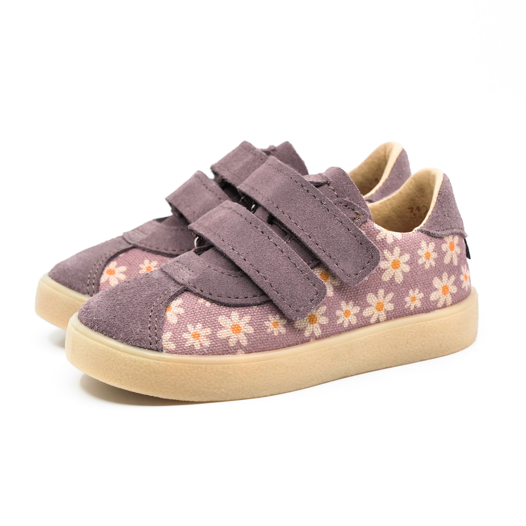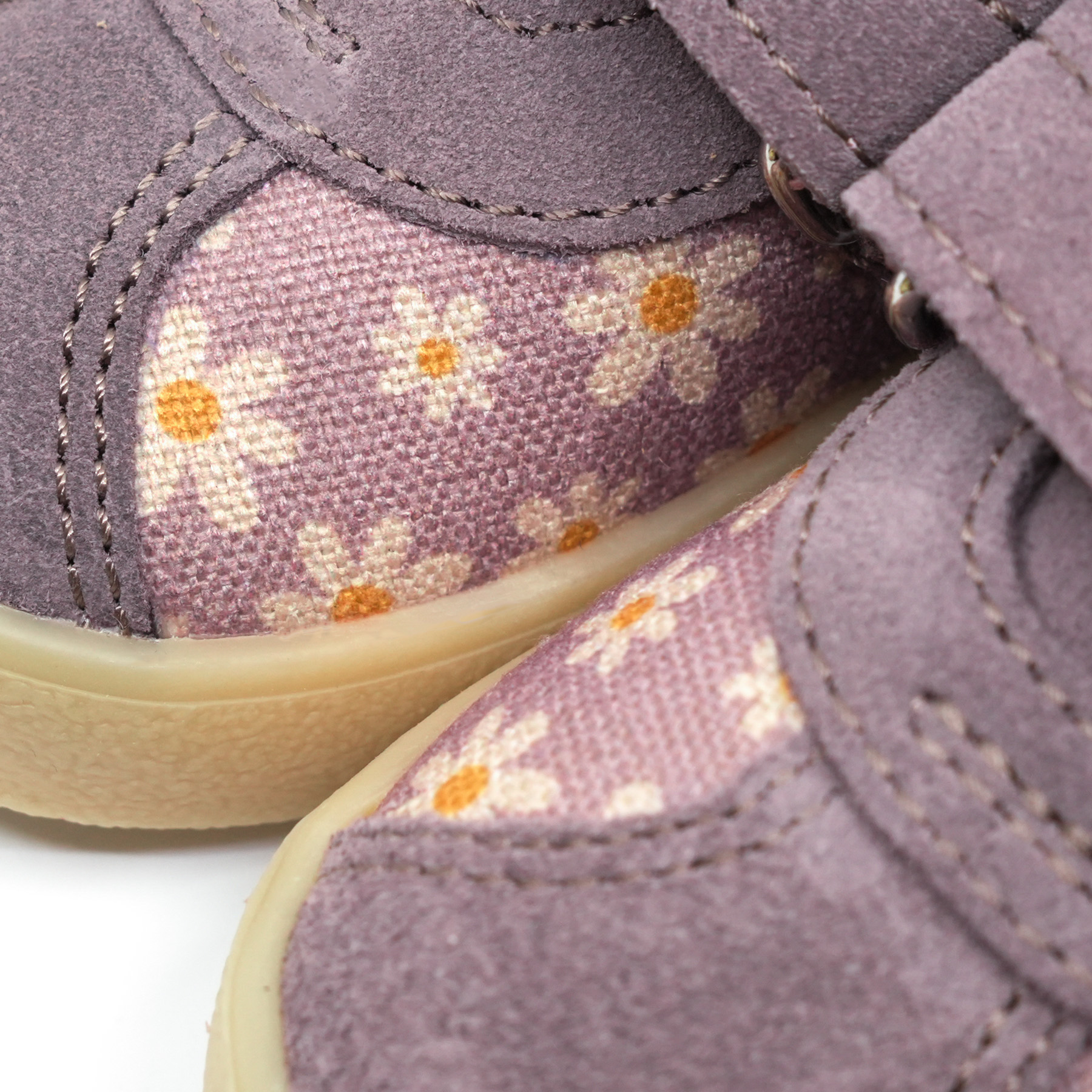 ✔️ Wierzch: skóra naturalna welurowa w kolorze lawendy (nosek, rzepy, język) + materiał Canvas z printem w stokrotki