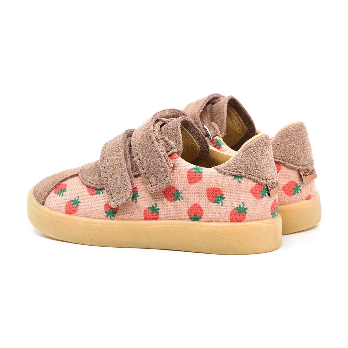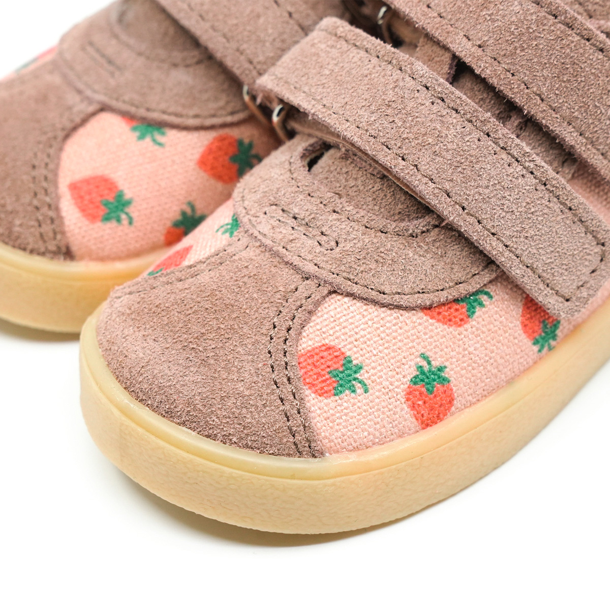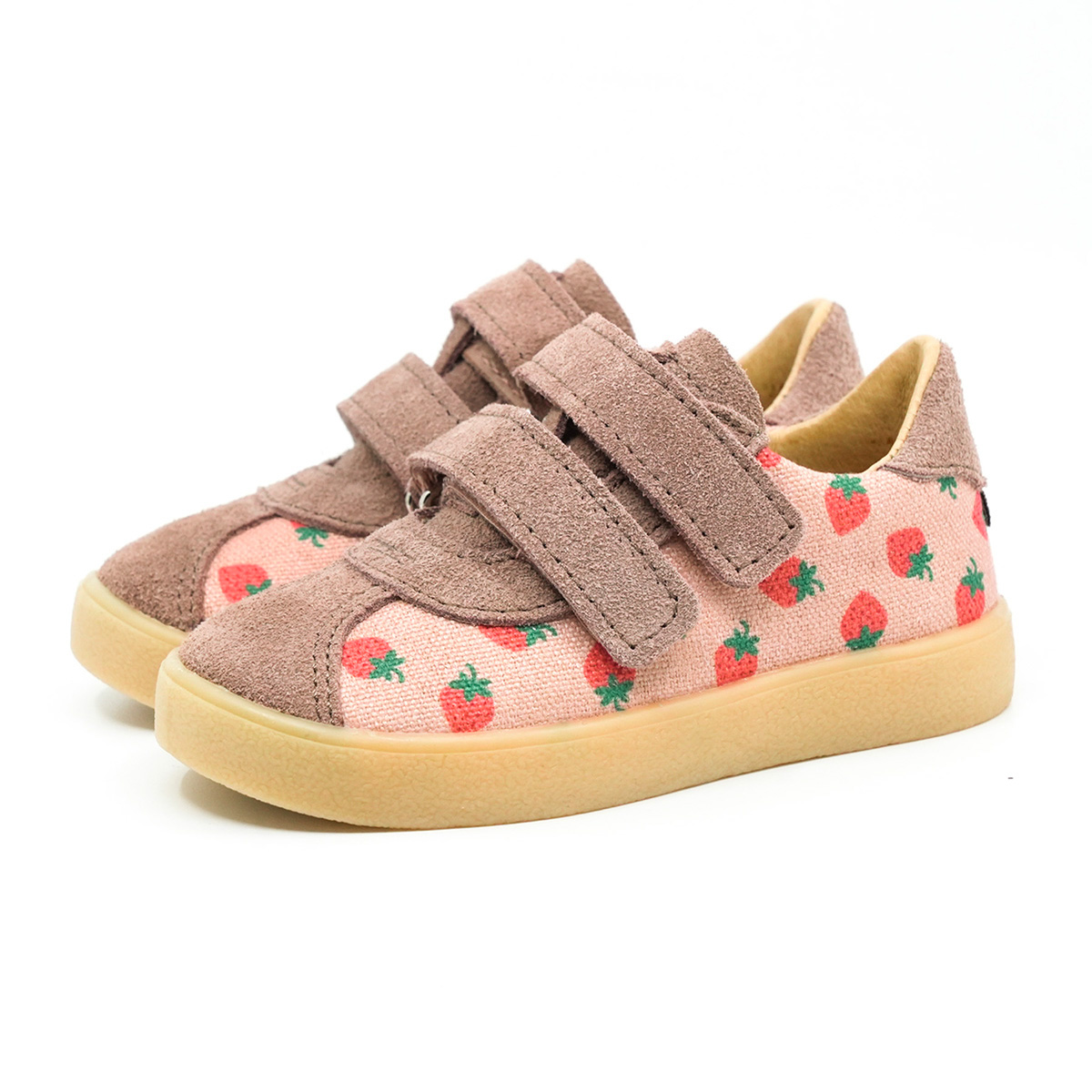 ✔️ Wierzch: skóra naturalna welurowa w kolorze rosa (nosek, rzepy, język) + materiał Canvas z printem w truskawki