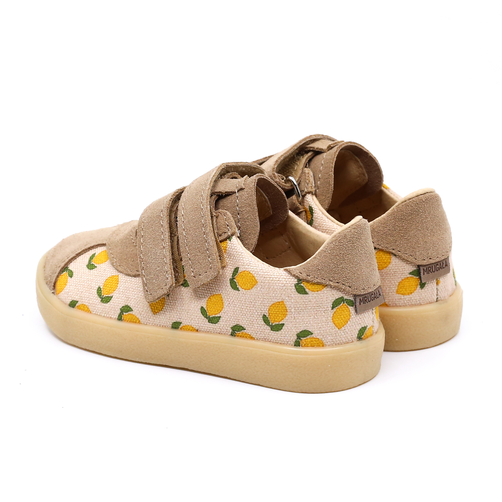 Wierzch: skóra naturalna welurowa w kolorze beżowym, bawełna canvas z nadrukiem w cytryny