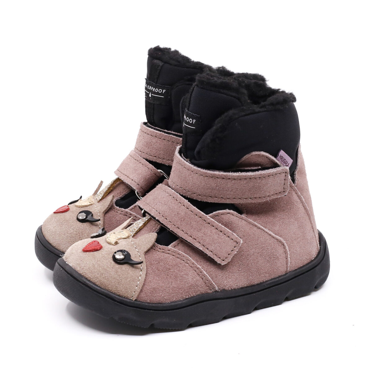 Zimowe buty dziecięce MRUGAŁA Heli BAREFOOT z membraną TE-POR – Pony Rosa połysk trzewiki ocieplane | Wodoodporne, oddychające, elastyczne i ciepłe.